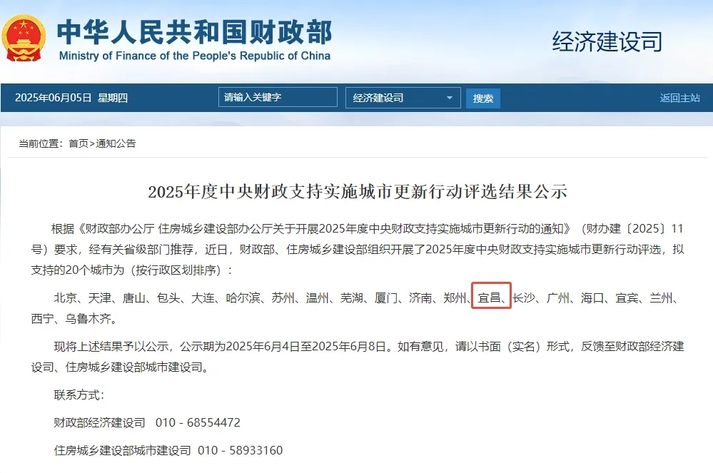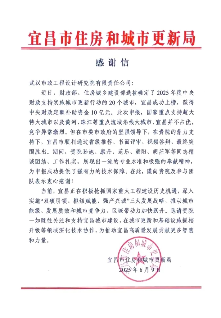 2025年6月4日,國家財政部經(jīng)濟建設(shè)司與住房城鄉(xiāng)建設(shè)部城市建設(shè)司聯(lián)合發(fā)布《2025年度中央財政支持實施城市更新行動評選結(jié)果公示》,湖北省宜昌市成功入圍。武漢市政院作為唯一技術(shù)支持單位助力宜昌成功入選國家支持城市名單,充分彰顯了公司作為城鄉(xiāng)建設(shè)運營全過程咨詢智庫的卓越技術(shù)實力。