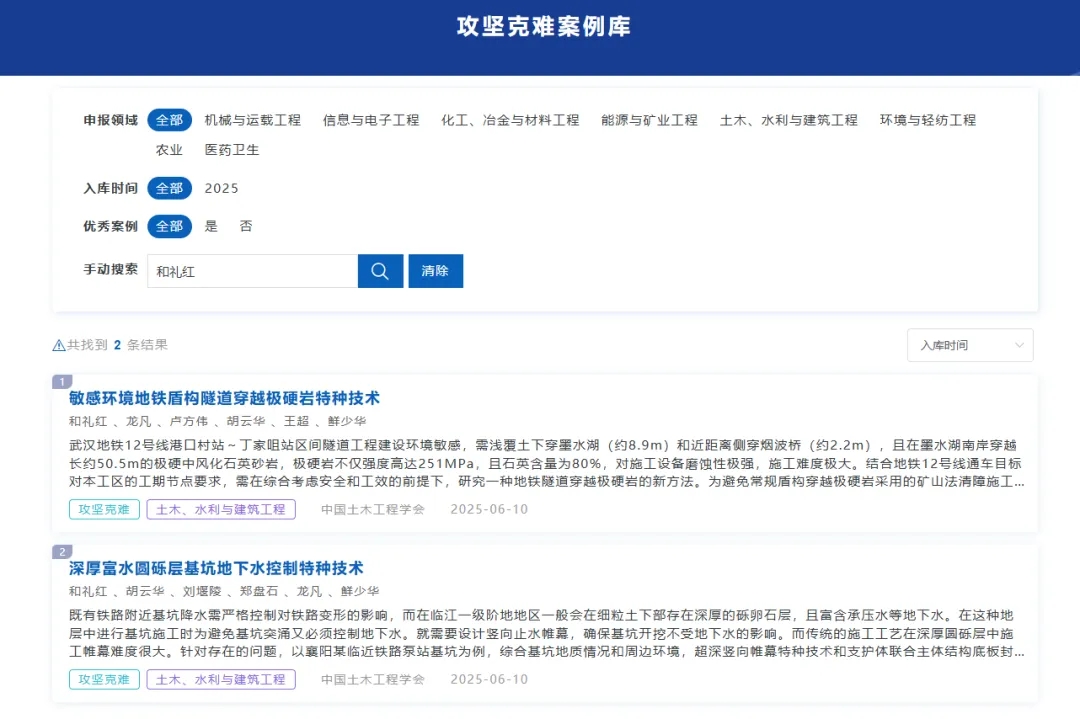 ? ? ?2025年6月4日,中國科協(xié)發(fā)布了《關于企業(yè)科技工作者評價案例成果征集遴選活動結果的通知》,公布了《企業(yè)科技工作者評價案例庫》,其中攻堅克難案例843項、成果轉化案例726項。武漢市政院巖土博士創(chuàng)新工作室申報的“敏感環(huán)境地鐵盾構隧道穿越極硬巖特種技術”、“深厚富水圓礫層基坑地下水控制特種技術”兩項攻堅克難案例與技術均成功入庫。