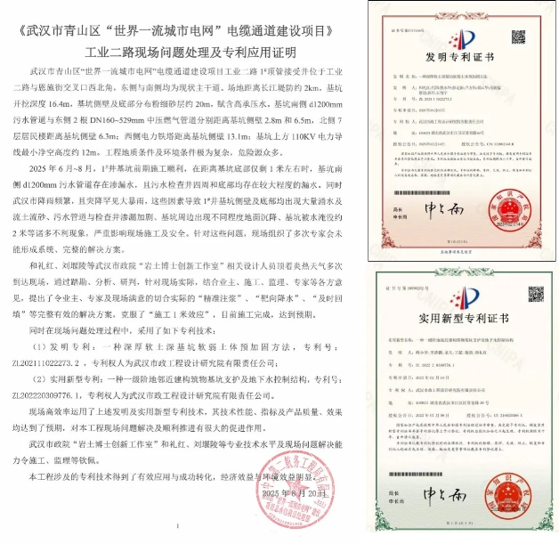 發(fā)明專利“一種深厚軟土深基坑軟弱土體預(yù)加固方法”(專利號:ZL202111022273.2)與實(shí)用新型專利“一種一級階地鄰近建構(gòu)筑物基坑支護(hù)及地下水控制結(jié)構(gòu)”(專利號:ZL202220309776.1),在武漢市青山區(qū)“世界一流城市電網(wǎng)”電纜通道建設(shè)項(xiàng)目——工業(yè)二路現(xiàn)場問題處理中實(shí)現(xiàn)了高效應(yīng)用。兩項(xiàng)專利的技術(shù)性能、實(shí)施效果及產(chǎn)品質(zhì)量均達(dá)到預(yù)期目標(biāo),成功完成了技術(shù)轉(zhuǎn)化,展現(xiàn)出良好的經(jīng)濟(jì)效益與環(huán)境效益。