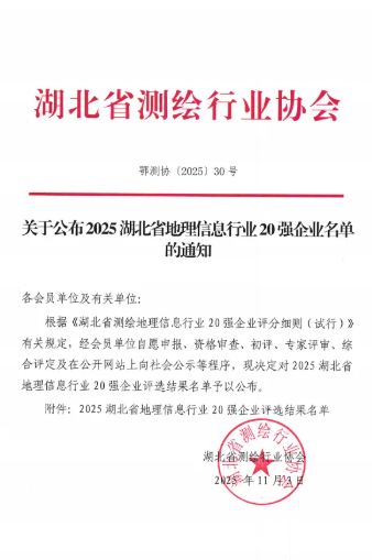 近日,從湖北省測繪行業(yè)協(xié)會傳來喜訊,武漢市政院憑借卓越的技術(shù)實力與行業(yè)貢獻,成功獲評“2025湖北省地理信息行業(yè)20強”。這一榮譽標志著公司在測繪地理信息領(lǐng)域的專業(yè)能力獲得省級權(quán)威認可,為企業(yè)發(fā)展里程碑再添濃墨重彩。