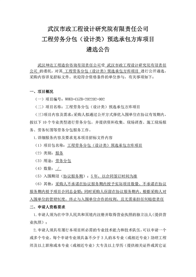 武漢市政工程設(shè)計(jì)研究院有限責(zé)任公司工程勞務(wù)分包(設(shè)計(jì)類(lèi))預(yù)選承包方庫(kù)項(xiàng)目遴選公告