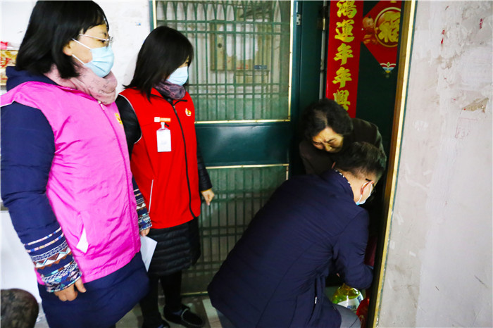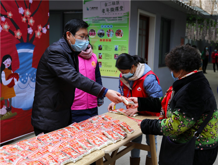 慰問期間,恰逢社區(qū)正在開展“臘八送福·甜蜜相伴”活動(dòng),談逢陽(yáng)一行也加入其中,熱情地為前來(lái)的社區(qū)居民發(fā)放臘八米,送上殷切的節(jié)日祝福,叮囑他們要做好防護(hù)。